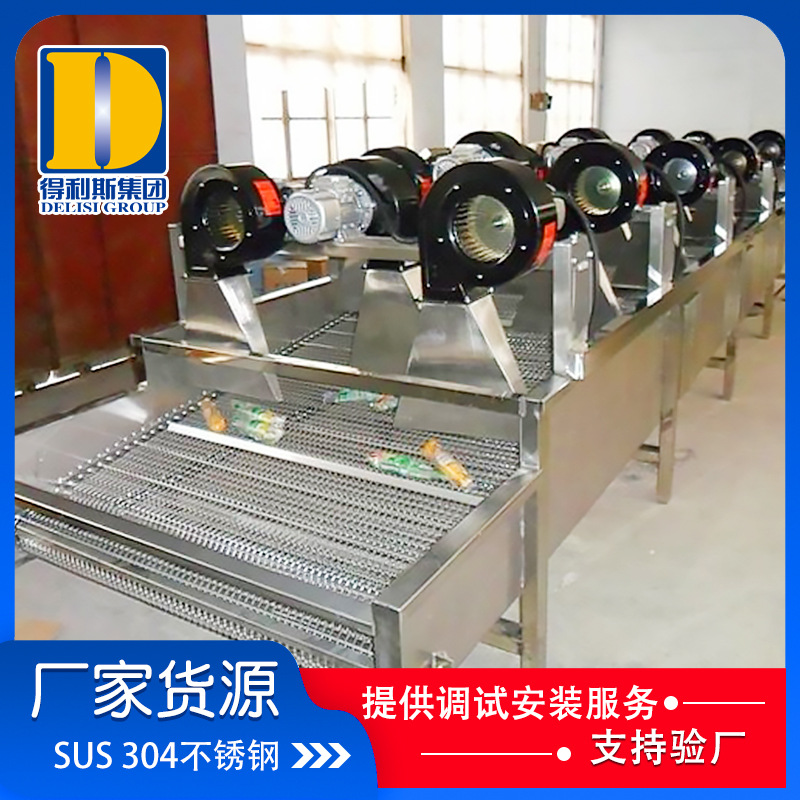 (3) 風干機除水后可直接裝箱,風干機實現連續作業(與連續工作殺菌機配套使用),只需將殺菌后的產品放入輸送網帶,經風干機產生的氣流經噴嘴噴射而出,從而達到包裝除水、除油漬、水垢等效果,即可裝箱入庫。